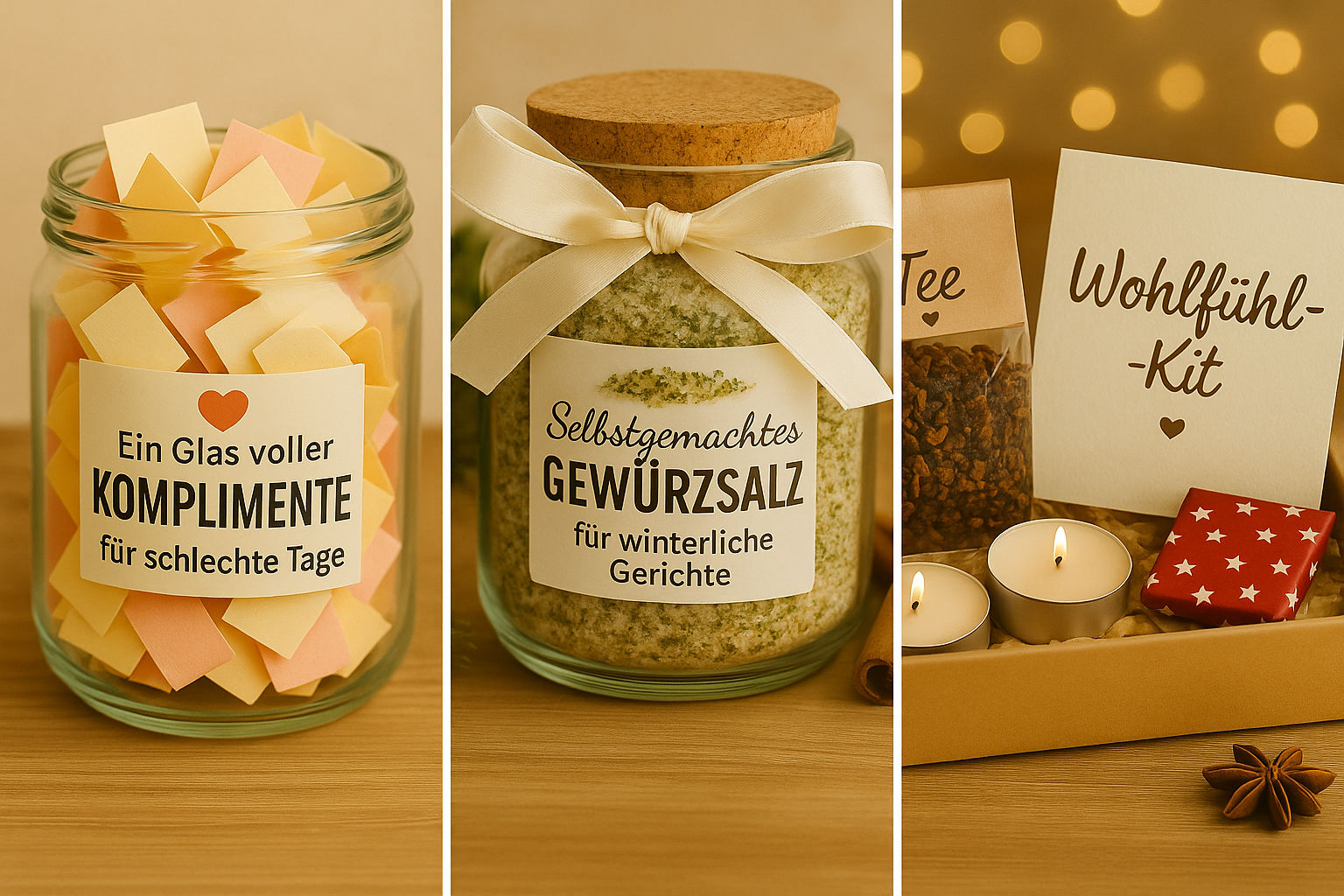 Auch Mini-DIYs lassen sich ganz spontan umsetzen: ein Glas voller Komplimente für schlechte Tage, eine kleine Sammlung eurer schönsten Fotos, ein selbstgemachtes Gewürzsalz für winterliche Gerichte oder ein kleines „Wohlfühl-Kit“ mit Tee, Kerzen und persönlichen Worten. Diese Kleinigkeiten zeigen vor allem eines – dass du dir Gedanken gemacht hast.